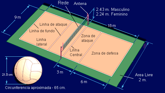 A área de um campo de voleibol é de 162 m2 e o volume de uma bola de voleibol é de 5204 cm3 aproximadamente.